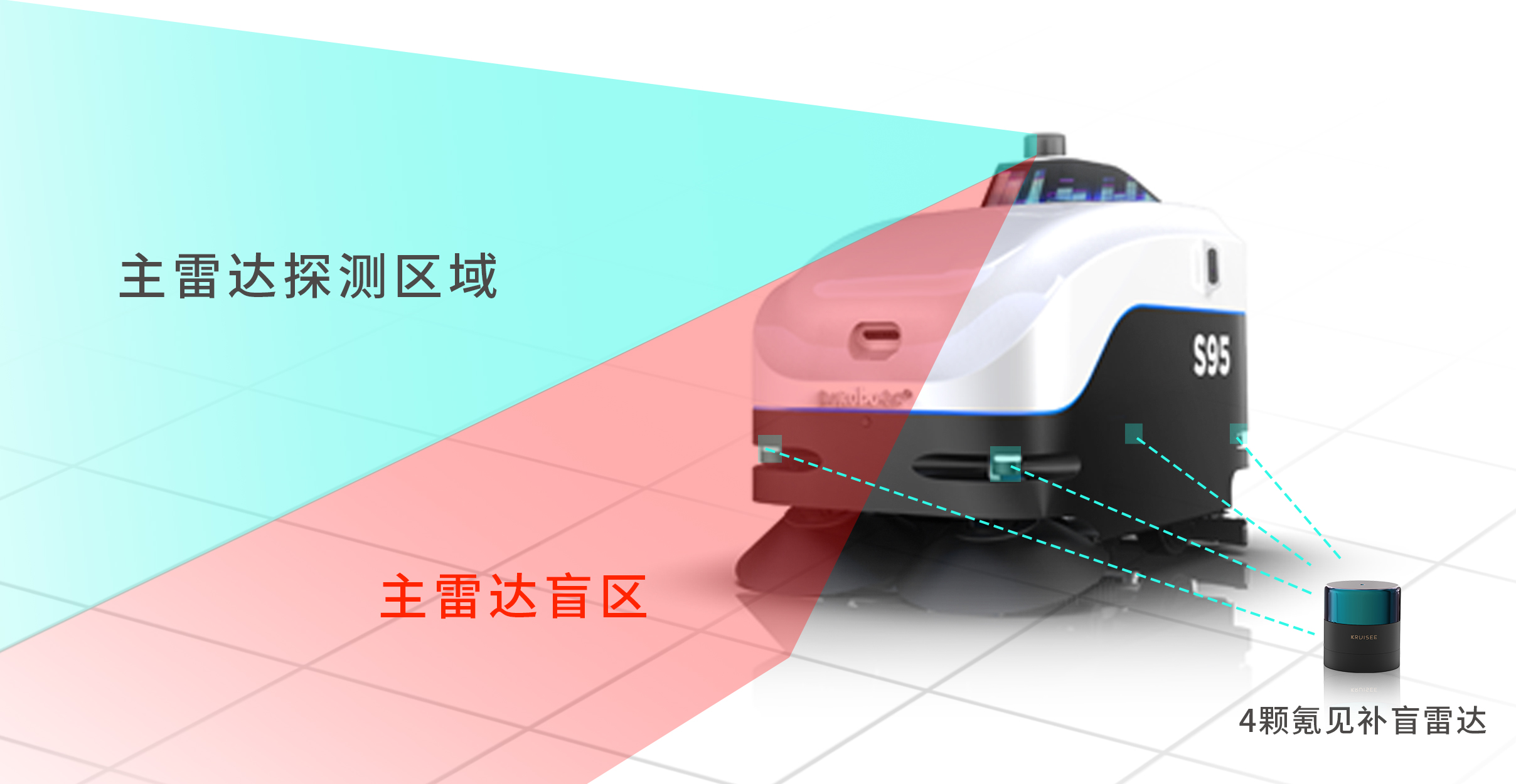 该智能清洁机器人车身装备了四周4颗氪见雷达用来补盲避障,再与其他传感器相配合,全方面赋予清洁机器人可靠稳定、宽视角、远距离以及高分辨率的三维深度感知能力,实现覆盖机器人四周完整的3D环境感知方案,确保机器人在亚运会期间完成360°安全高效清洁。